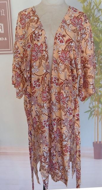 100% viscose. Straight sleeve kimono with waist tie. Length 105cm. Sleeve length 19cm. Width at armhole 30cm.