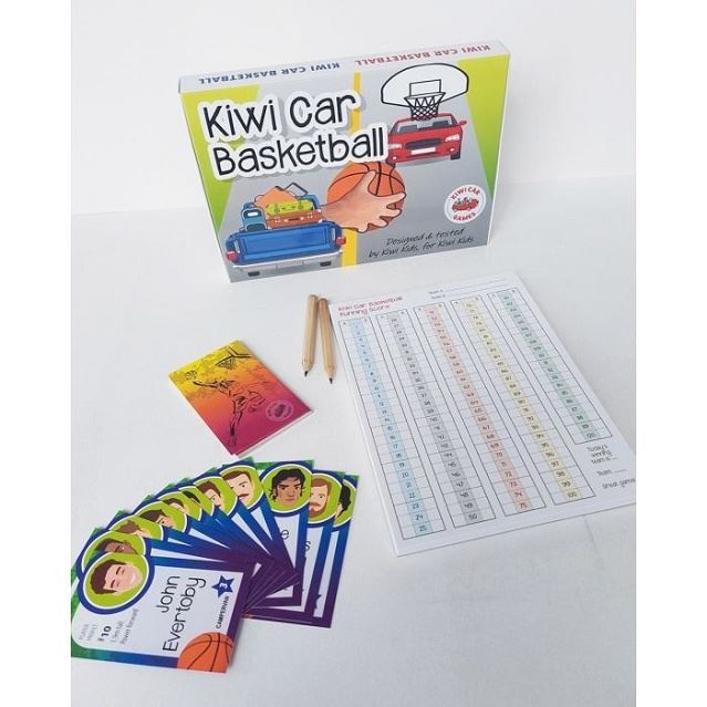 This car travel game comes with everything you need for Car Basketball including 24 player cards, 1 score pad, rules, 2 pencils and a sturdy glove compartment size box to store it all. Made in New Zealand.