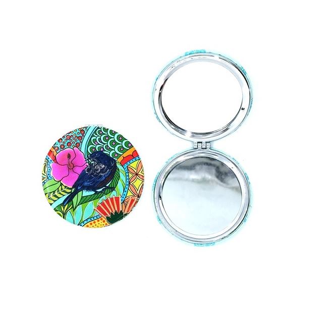This beautiful compact mirror is Tui Bird artwork by NZ local artist Lucia Laubscher. Size: diameter 70mm x depth 10mm.