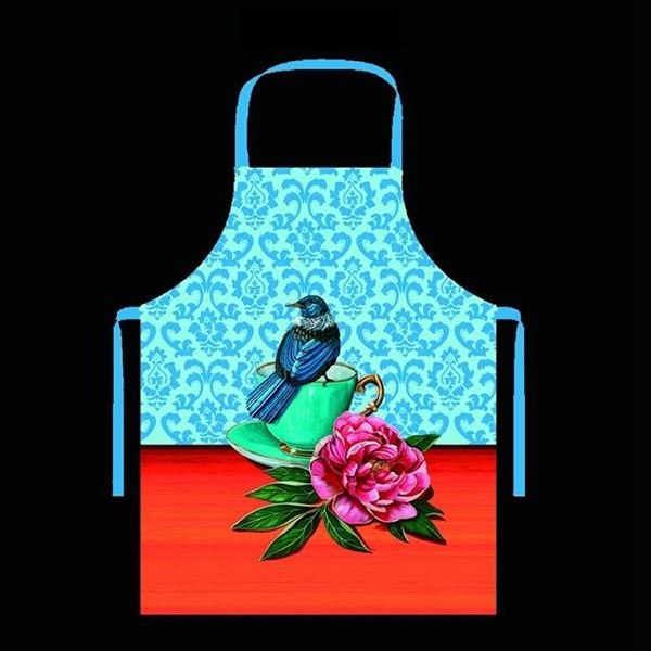 Beautiful NZ apron - Tui Bird with flowers. Artwork by NZ local Artist Angie Dennis. Size: 70cm x 85cm. 100% polyester.