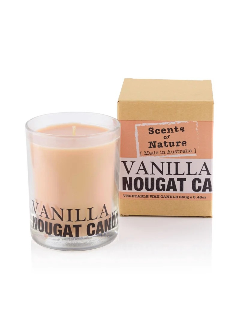 Fragrance your home with the decadently sweet scents of vanilla and nougat candy with our scented soy candle.
