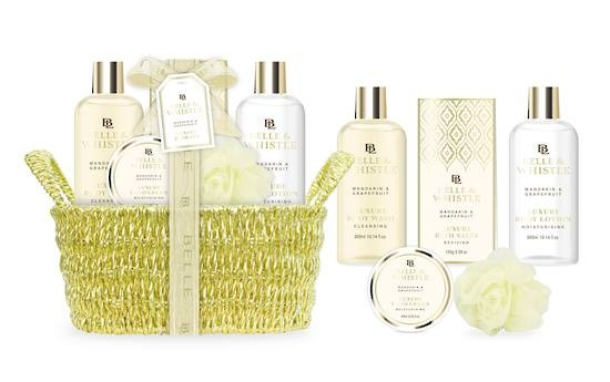 Mandarin & Grapefruit 5 Piece Gold Basket Set. 300ml - body wash, 300ml - body lotion, 60ml jar - hand cream, 150g - bath salt, 15g - bath puff.