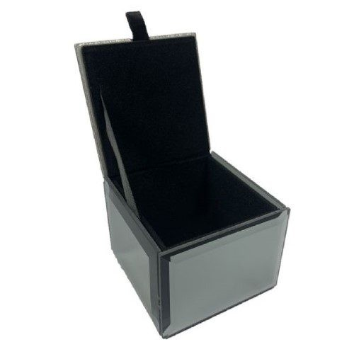 Glass mirror patterned jewellery box with single storage area felt lined. Hand crafted to the finest finish with all glass edges bevelled to give it a superior finish. H:6.5 x W:7.5 x D:7.5 cm.