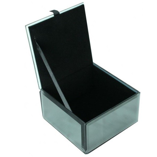 Glass mirror patterned jewellery box with single storage area felt lined. Hand crafted to the finest finish with all glass edges bevelled to give it a superior finish. H:6.5 x W:11 x D:11.5 cm.