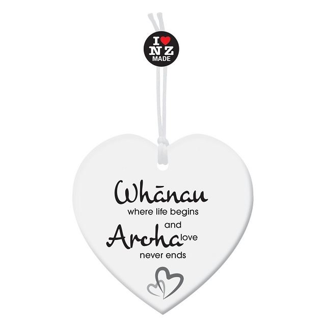 Acrylic White Heart Wall Hanging - Whanau. Size: 9cm x 9cm.